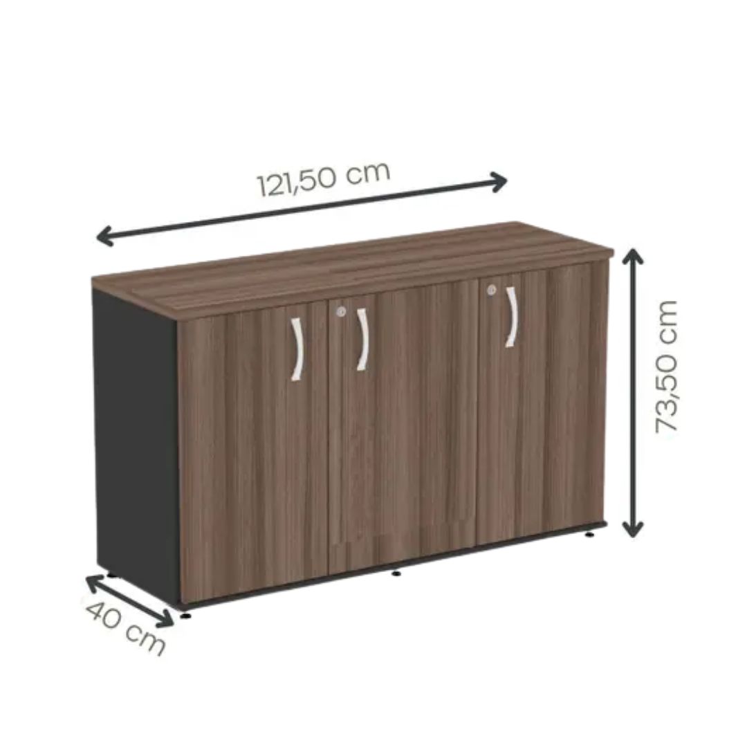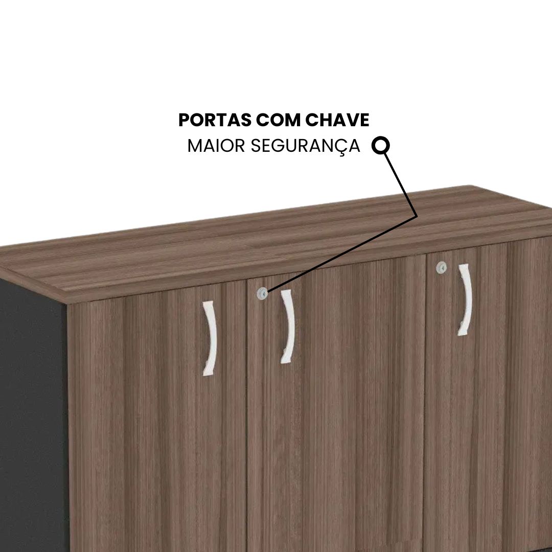 Com três portas equipadas com prateleira interna, o armário oferece amplo espaço de armazenamento, facilitando a organização de documentos, livros, materiais de escritório e itens essenciais do dia a dia. O tampo de 25 mm com acabamento em fita ABS de 1 mm garante maior resistência e sofisticação ao design.