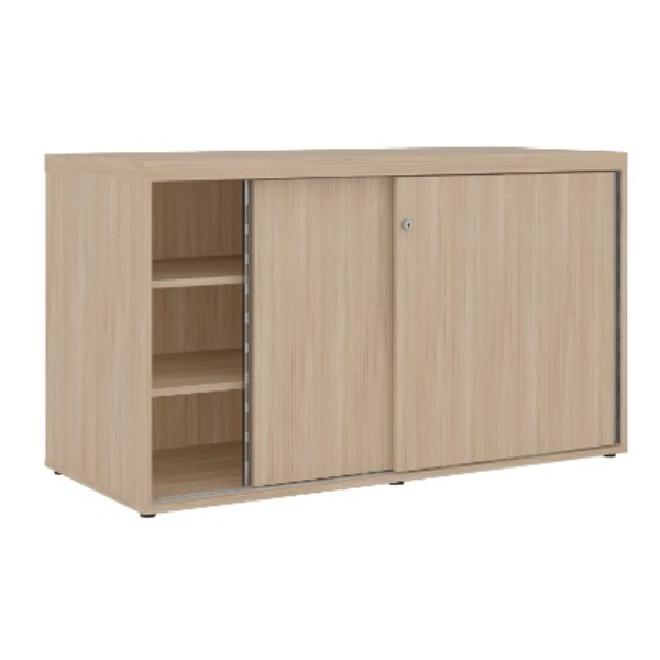 Este armário baixo apresenta uma porta de correr que desliza suavemente, economizando espaço e evitando a necessidade de abrir portas convencionais, ideal para ambientes com restrições de espaço. Além disso, possui duas portas e é equipado com prateleiras internas para a organização eficaz de documentos, suprimentos de escritório e outros itens essenciais.