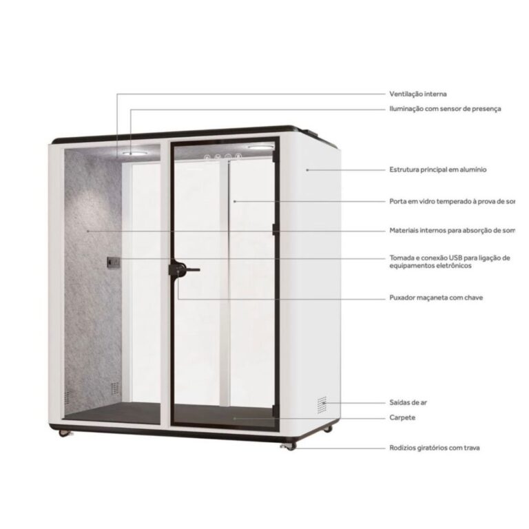 Seu isolamento acústico de 28±3dB, certificado pela ISO 23351-1:2020, garante privacidade sonora de alto nível, permitindo uma comunicação clara, sem ruídos externos. Assim, cada ideia pode ser discutida com foco total e produtividade.