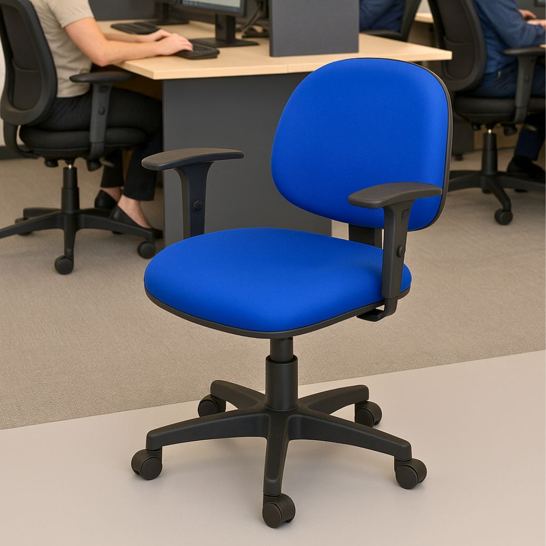 Seu design funcional se adapta perfeitamente a diferentes perfis de usuários, sendo ideal para salas administrativas, posições operacionais ou espaços de atendimento ao cliente. A base giratória com pistão a gás permite mobilidade suave e resistência no uso contínuo, enquanto os braços com regulagem de altura proporcionam apoio ergonômico aos braços e ombros, reduzindo tensões musculares.