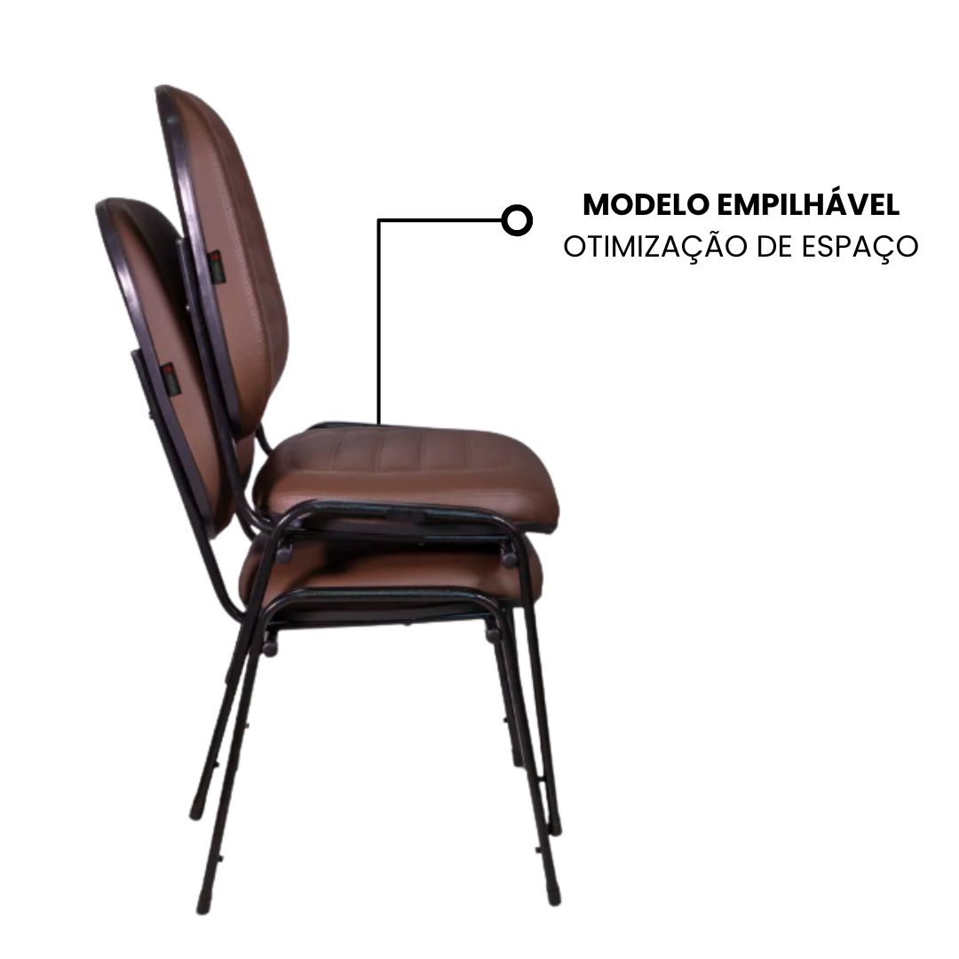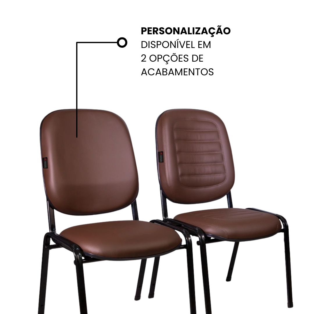 O assento e o encosto estofados em courino marrom trazem conforto e facilidade na higienização, sendo ideais para ambientes que precisam de manutenção prática. O encosto anatômico se ajusta às costas, proporcionando bem-estar em períodos prolongados.