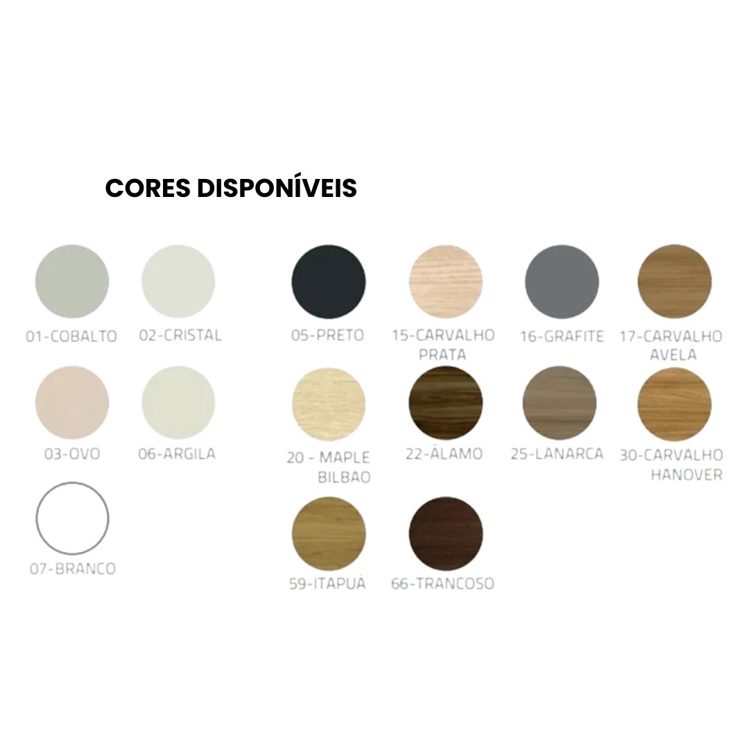 Fabricado em BP de 18mm, o móvel apresenta estrutura robusta e estável, composta por laterais, fundo e base no mesmo padrão de espessura. O tampo recebe acabamento com fita de borda de 1mm, garantindo maior resistência ao uso contínuo e excelente acabamento visual. As portas também são produzidas em BP de 18mm, com fita de 2mm, reforçando a durabilidade e valorizando o design.