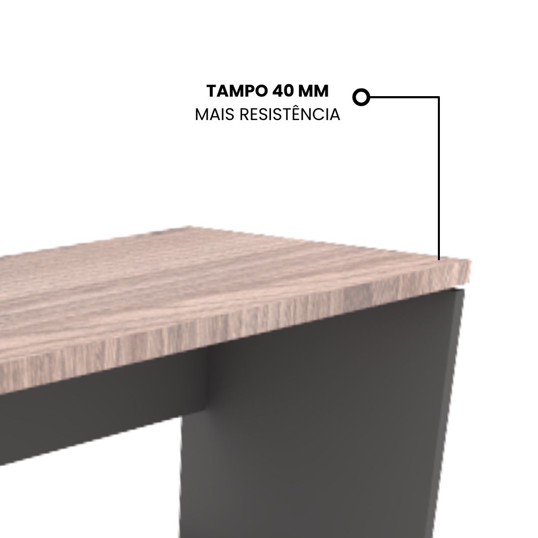 O tampo, com espessura de 40 mm, confere robustez e presença visual, além de garantir resistência frente ao uso contínuo. A linha se destaca justamente por unir o charme de uma diretoria com a racionalidade de um móvel “trivial”, sendo excelente opção para quem precisa compor áreas individuais ou coletivas com estilo e eficiência.