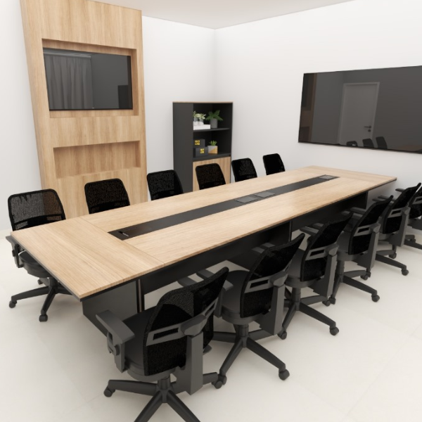 Além da estética, a mesa possui recursos modernos para atender demandas empresariais. Tomadas elétricas embutidas mantêm dispositivos prontos para uso, eliminando cabos. Sua estrutura robusta permite reuniões ininterruptas.