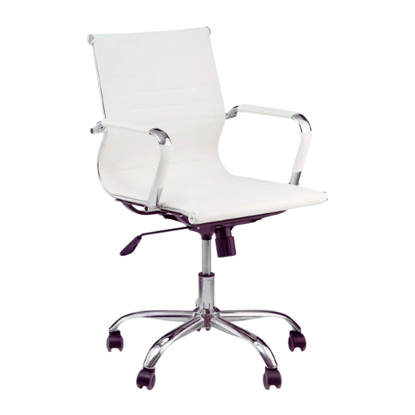 A estrutura da poltrona é feita de aço cromado, conferindo robustez e uma estética moderna ao design. Os braços fixos, também em aço cromado e revestidos em PU, complementam o visual sofisticado e oferecem suporte adicional durante o uso. A combinação de aço cromado e PU cria um contraste visual que realça o estilo contemporâneo da poltrona.