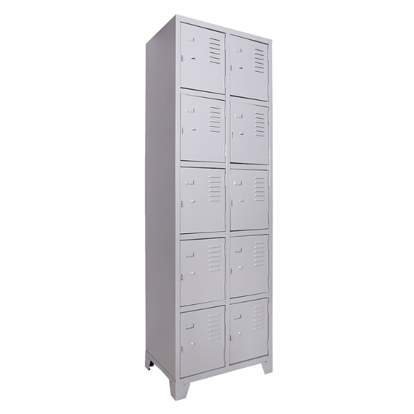 Com 10 vãos sobrepostos, o roupeiro proporciona uma distribuição prática para os pertences dos colaboradores, mantendo o ambiente organizado e livre de bagunça. Cada porta possui reforço vertical interno, aumentando a durabilidade e estabilidade do conjunto. Para segurança, conta com travamento tipo fecho, permitindo o uso de cadeados externos.